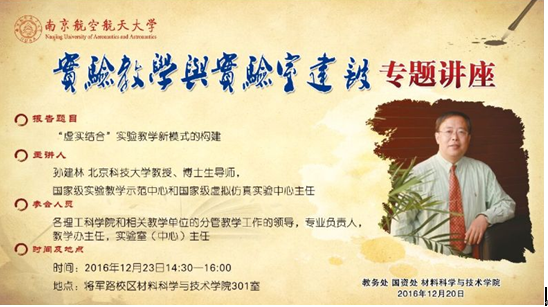 12月23日下午,由我校教务处、国有资产管理处联合举办,tyc7111cc太阳成集团承办的“实验教学与实验室建设专题报告会”在将军路校区材料学院楼举行。北京科技大学国家级材料实验教学示范中心和国家级材料虚拟仿真实验中心主任孙建林教授为我校理工科学院教学院长、系主任、专业负责人、实验室主任作了题为《“虚实结合”实验教学新模式的构建》的报告,奉献了一场实验教学与实验室建设改革发展的豪华大餐,受到与会人员的热烈欢迎和积极响应。教务处副处长江爱华主持了本次专题报告会。