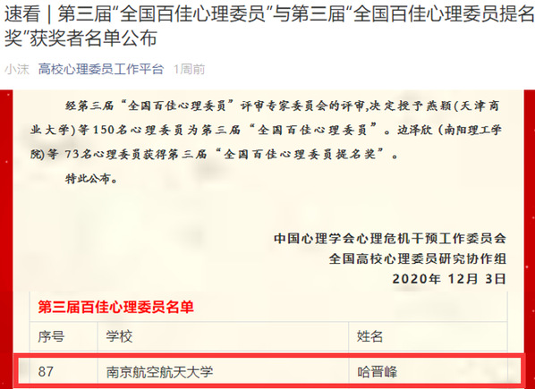 2020年是全国高校心理委员工作研讨会暨朋辈心理辅导论坛举办的第十五年。11月23日上午,第十五届全国高校心理委员工作研讨会暨朋辈心理辅导论坛以线上直播的形式正式拉开帷幕。经过全校综合选拔,示推荐了我院的哈晋峰、电子信息工程学院的罗岚、民航/飞行学院的张晨阳、同学参与全国百佳心理委员的评选。最终,哈晋峰从全国248名参赛者中脱颖而出,荣获“第三届全国百佳心理委员”称号,罗岚,张晨阳同学荣获“第三届全国百佳心理委员提名奖”。